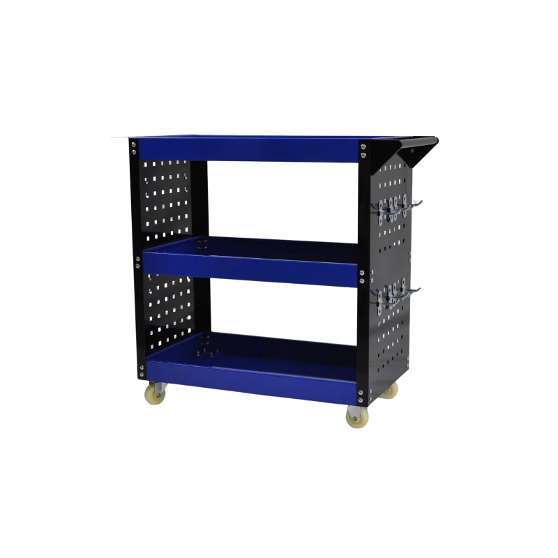 Tämä 3-hyllyinen työkalukärry rei'itetyillä sivupaneeleilla on erittäin monipuolinen työkalu, joka sopii monenlaisiin tehtäviin:
