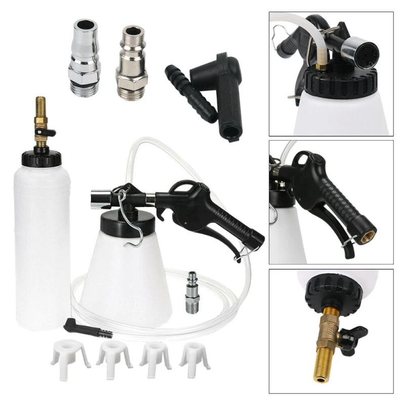 Se sisältää 1 litran jarrujen ilmaimen, 0.75 litran varapullon turvasulkimella, ripustuskoukun, 2 metrin silikoniletkun, pikaliittimen kompressorille ja 4 adapteria.